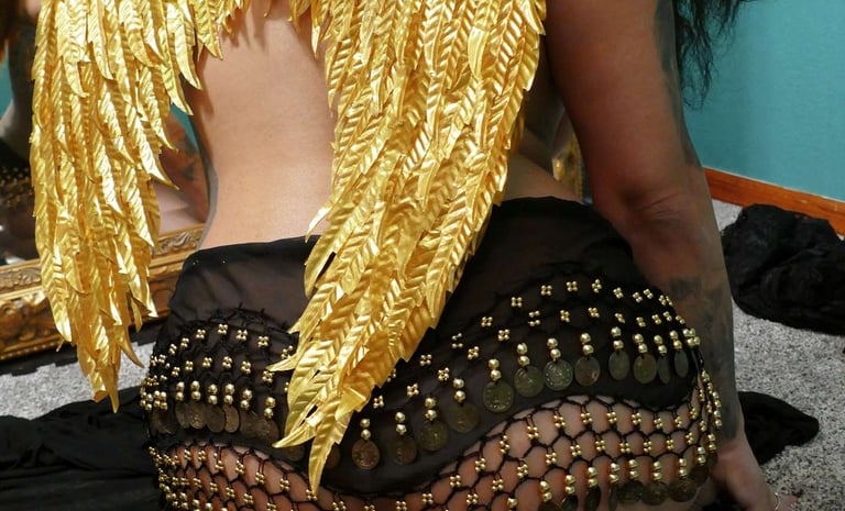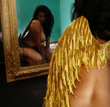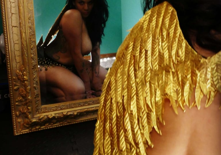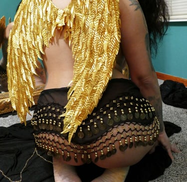 I hesitated and gasped at the prospect that she could be, what? An angel? Despite the urge to turn tail and run, pretend like I saw nothing and say as much to anyone who asked, I instead stepped into the crater. She had rolled onto her back, laying on her golden wings and looking tremendously exposed. Aside from the golden feathers and a broken chain attached to a thin gold anklet, she wore only one piece of clothing. A piece of sheer black fabric tied around her waist and nothing else.